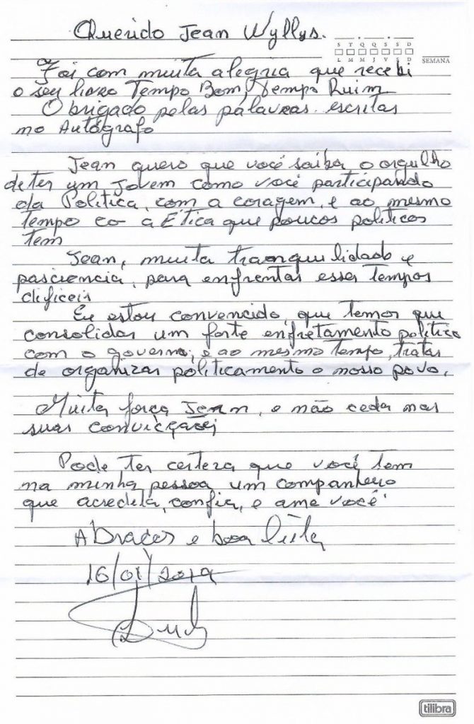 Oportunamente, o ex-presidente elogia o deputado pela sua coragem e ética e diz que será preciso ter muita tranquilidade para enfrentar esses tempos difíceis. Segundo o deputado, está é a segunda carta que o mesmo recebe de Lula. Jean Wyllys, na postagem em que mostra a carta recebida do ex-presidente, chama-o de sensível, inteligente, grato, acolhedor e generoso.